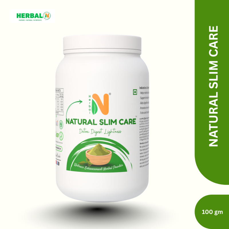 Natural Slim Care is a 100g herbal wellness powder made with a synergistic blend of 8 traditional herbs known to support weight management, digestion, and detoxification. Key ingredients like Terminalia chebula (Kadukkai) and Cardiospermum halicacabum (Mudakathan) help restore internal balance through natural cleansing and digestive stimulation.